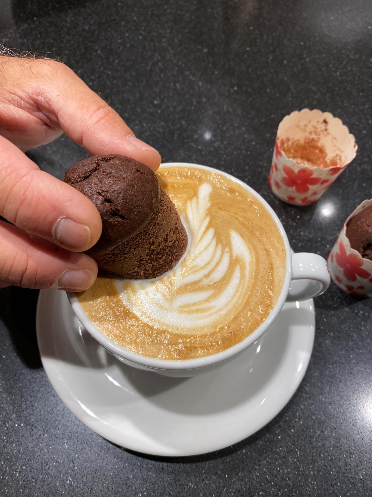 Noi abbiamo gustato i mini muffin al cacao il giorno seguente a colazione con un flat white, preparato sempre con un Twongere Kawa Coko del Rwanda tostato per espresso dalle note ci cocco, frutta secca e spezie ed una leggera acidità, che ha creato un connubio perfetto tra il latte ed il muffin, il quale con la sua consistenza leggermente spugnosa era perfetto per l’inzuppo… che ovviamente non abbiamo fatto mancare!