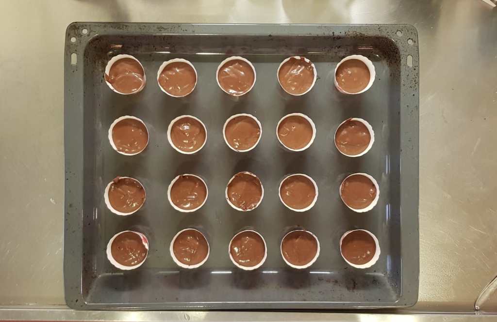 Suddividete il preparato in 20 pirottini da muffin e cuocete in forno per infornate per 15 – 17 minuti a 180 °C.