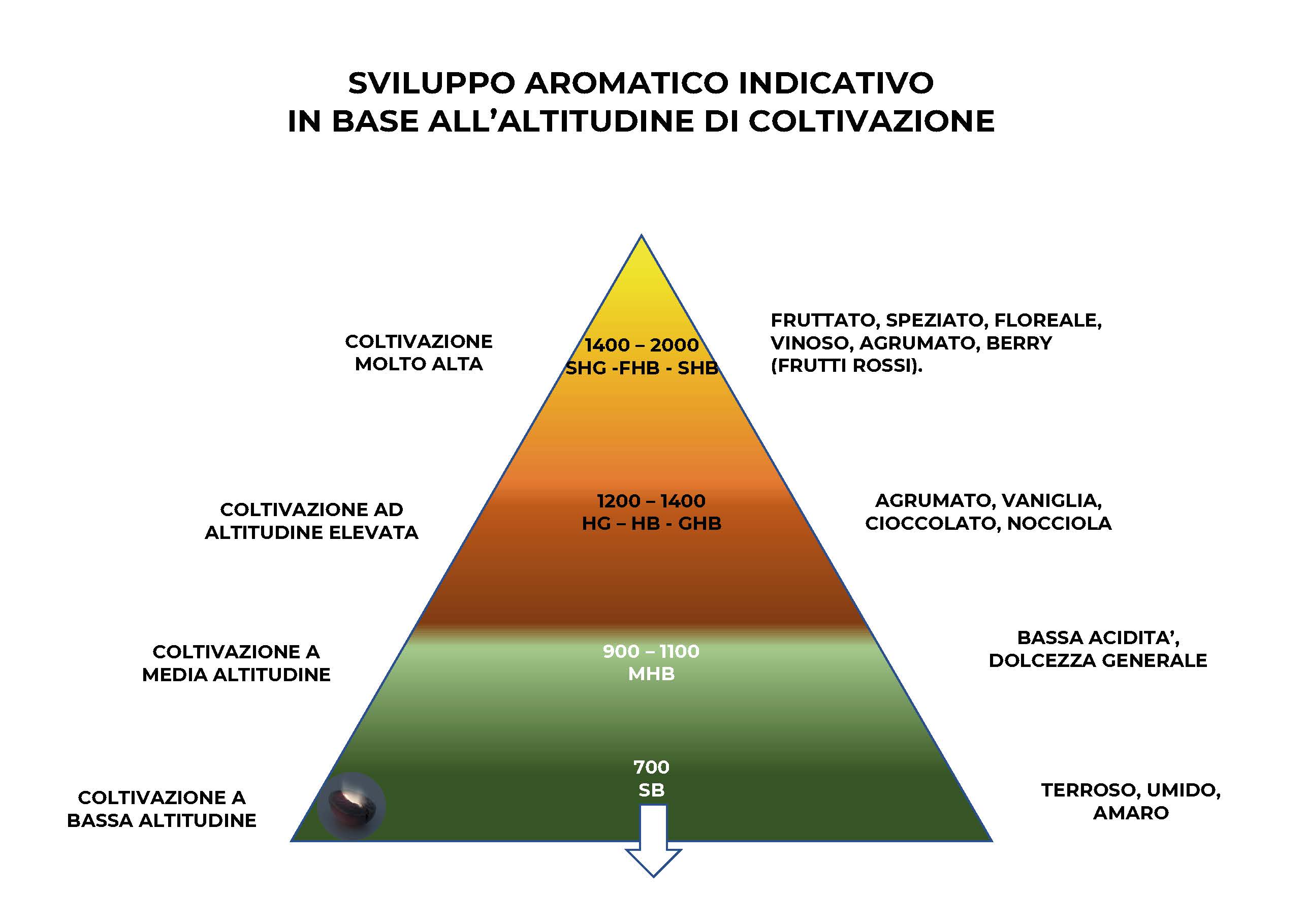 Per comodità eccovi un’immagine che ho realizzato rappresentativa degli sviluppi aromatici suddivisi per fasce di altitudine, che ovviamente è solo indicativa, ma che vi offre un’idea di come sia importante l’insieme di tutti i fattori sopra elencati nella determinazione del sapore del caffè!