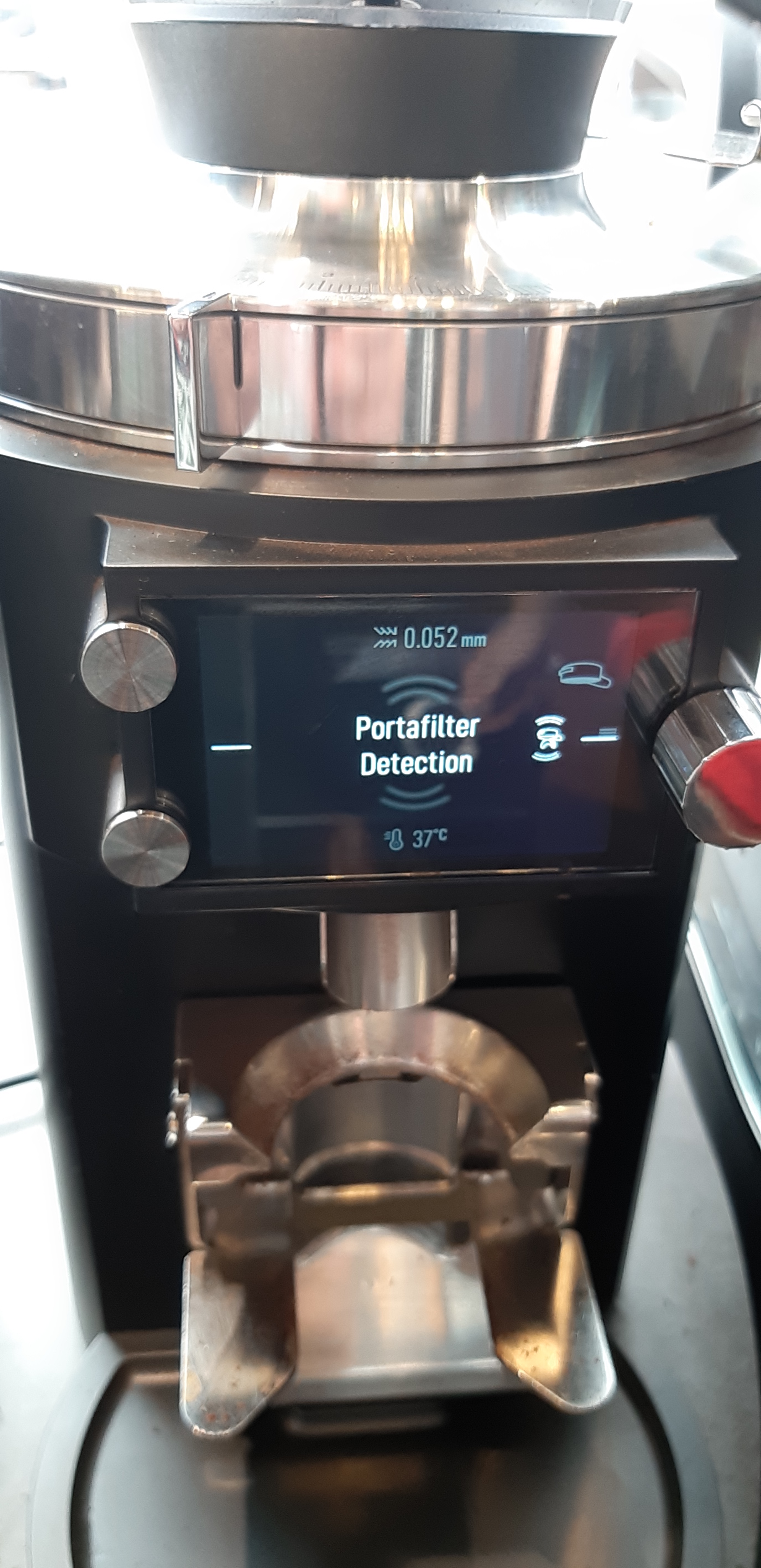 La perfezione va ricercata nei dettagli, e qui di dettagli notevoli ce ne sono parecchi, a cominciare dalla silenziosità in fase di macinatura, passando dall’indicazione in micron del posizionamento delle macine fino all’agevole rimozione del coperchio che incorpora la ghiera di regolazione della macinatura per poter effettuare una corretta pulizia del gruppo macine senza che al rimontaggio si abbia una variazione della macinatura, cosa che accade con i normali grinder con regolatore micrometrico a vite.
