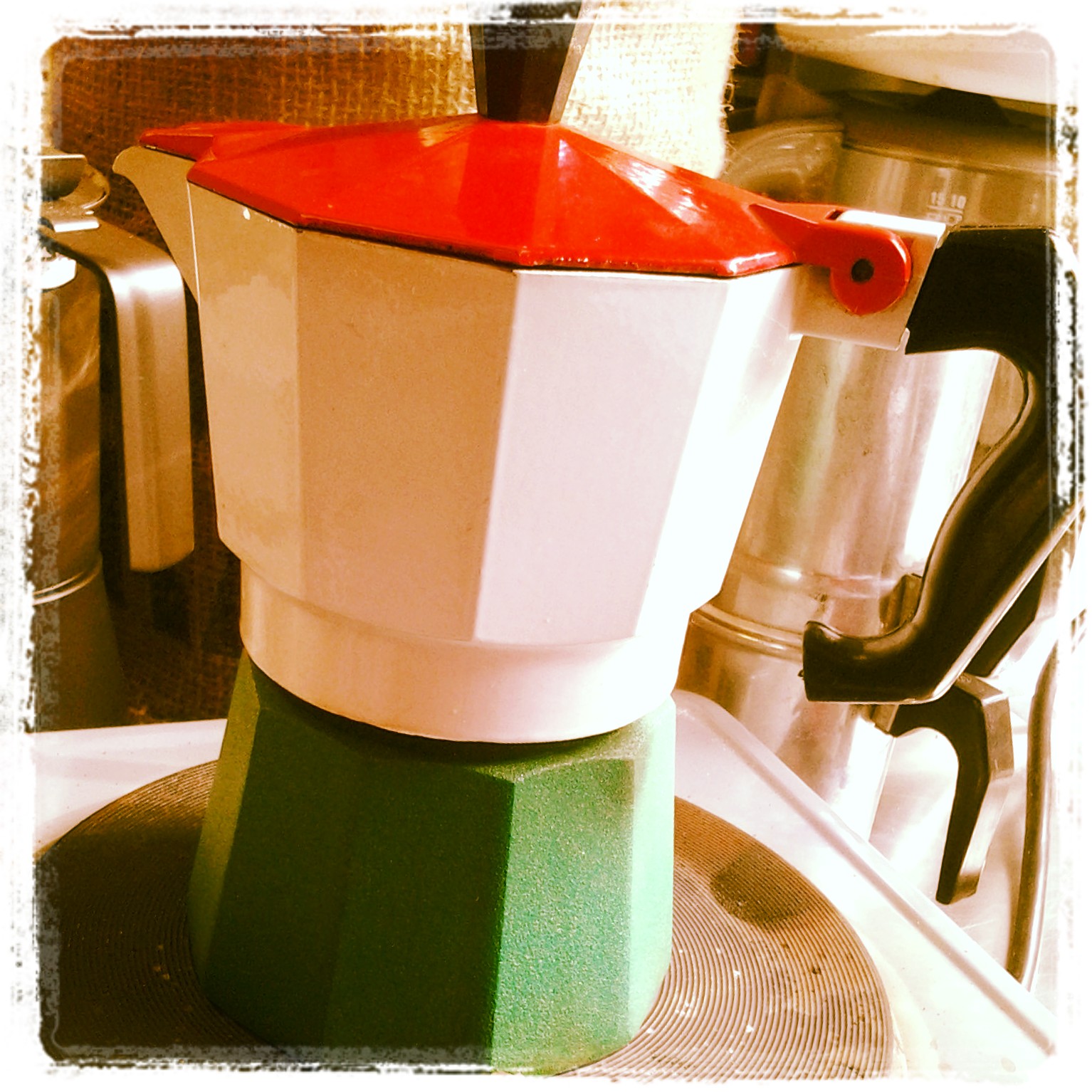 ALLUMINIO: rapida nell’andare in temperatura, leggera nell’utilizzo, presenta però particolari accortezze da porre nel suo utilizzo, soprattutto dovute alla “morbidezza” del materiale di costruzione, ed alla sua porosità. Occorre infatti pulirla accuratamente sempre dopo ogni utilizzo e evitare di riporla bagnata. Necessita di una decalcificazione costante, soprattutto del fondello, e se non si presta molta attenzione quando si svuota il filtro, “sbattendolo” per togliere il caffè esausto, le probabilità che poi la parte ribattuta si rovini rapidamente non consentendo poi più una adeguata tenuta della guarnizione, sono elevate. Tra i diversi materiali è uno di quelli che tende a cedere maggiormente un sapore “metallico” alla bevanda, e scaldandosi molto ed in modo uniforme, di cedere sovente un sapore di bruciato al caffè.