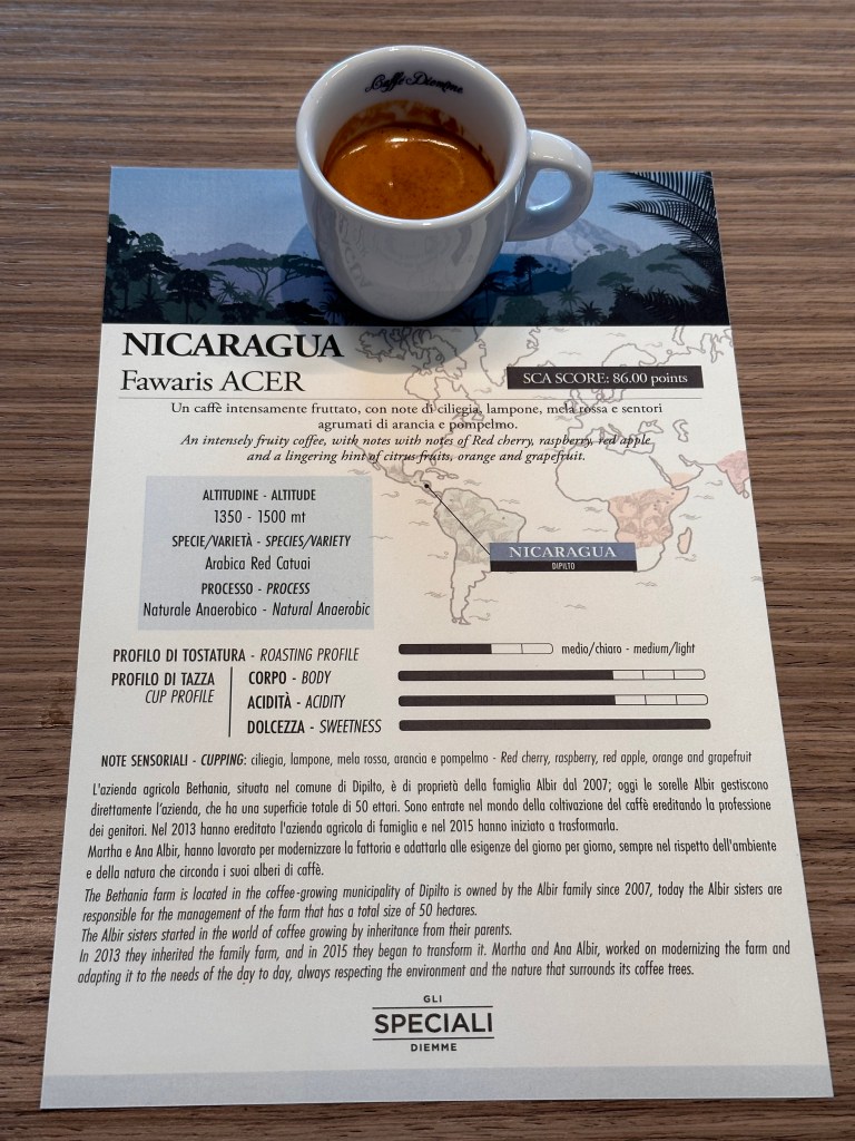 I concorrenti hanno dovuto impegnarsi non poco per replicare le particolari note aromatiche del caffè della linea GLI SPECIALI di Diemme, un Nicaragua naturale con note di mandorla, ciliegia, uva rossa e pasticceria preparato dal trainer di Diemme Academy Pierpaolo Meneguolo.