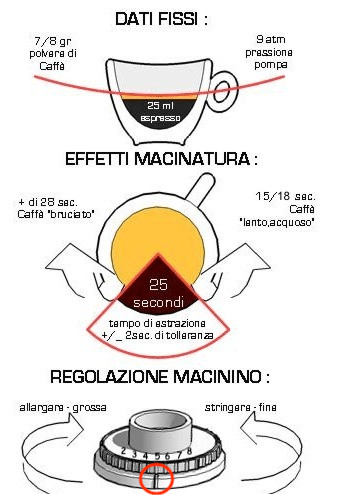 Se ipotizziamo che il tempo corretto per la preparazione del nostro espresso, con un volume di circa 25 ml in tazza, sia di 25 secondi, con una tolleranza di 2 secondi in più o in meno, nel caso di un discostamento maggiore potremo valutare di regolare la macinatura secondo lo schema rappresentato di seguito.